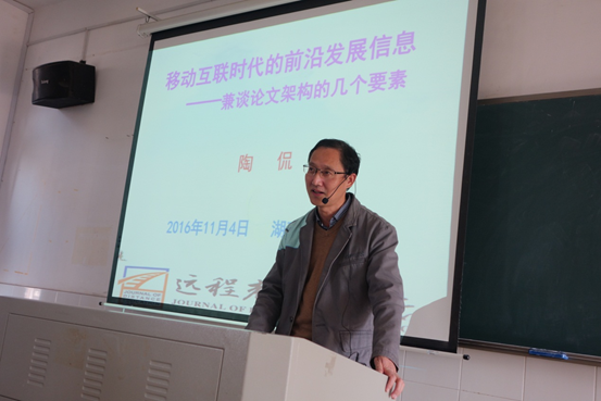 11月4日,中国教育技术协会理事,中国教育技术协会期刊专业委员会副主任,中国教育技术协会教育游戏分会副理事长,华人探究学习协会理事,《远程教育杂志》(CSSCI)执行副主编兼编辑部主任陶侃教授应邀来伟德官网讲学,为200余名师生作了以“移动互联时代的前沿发展信息——兼谈论文架构的几个要素”为主题的学术报告。校长助理、信息科学与工程学院院长李勇帆教授主持报告会。