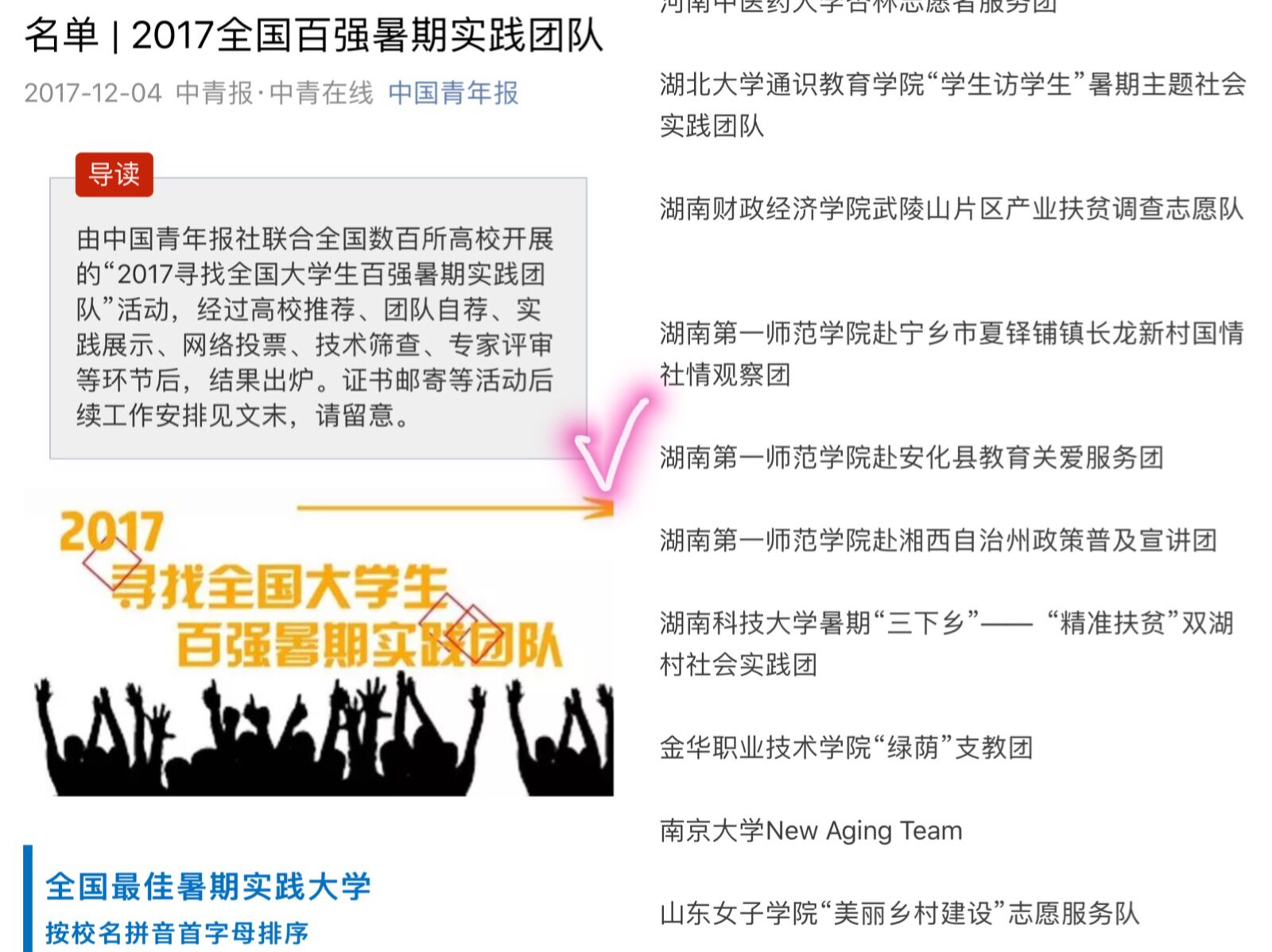 在团中央未来网启动的“奋斗中国梦·实践致青春2017年全国大中专学生暑期‘三下乡’新媒体公益传播力展示活动”中,伟德官网三下乡团队“赴安化县‘重走主席游学路’教育关爱服务团”成功入围“优秀团队”、“优秀报道”和“最美中国发现”奖项,学院辅导员唐瑞鸿入围“优秀指导老师”奖项。