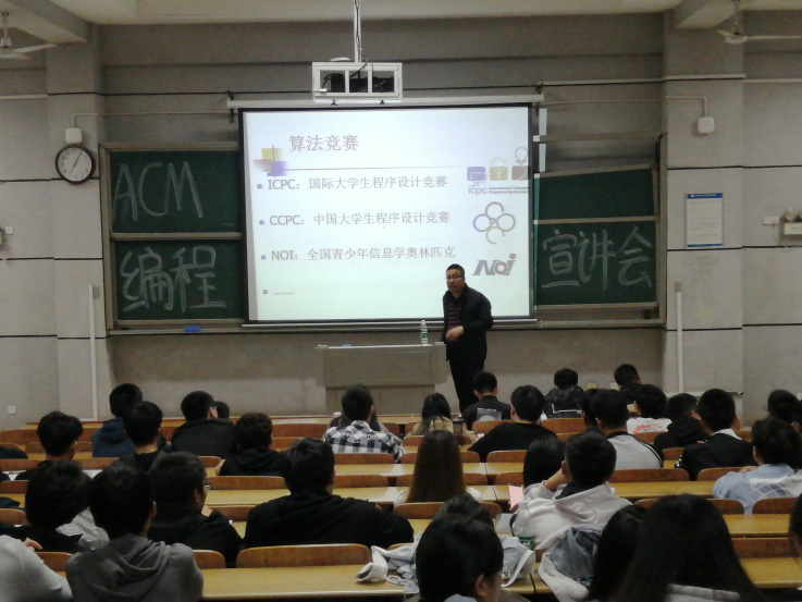 会上,田祖伟教授分别从赛事构成、组队要求、比赛规则、知识储备、解题步骤以及评分细节六个方面进行了细致讲解。他指出ACM程序设计竞赛是对编程能力、算法能力、分析问题能力以及团队合作能力的综合考查,同时表示欢迎各院对程序设计充满兴趣的同学前来学习,学院会通过对参赛学生进行定期培训、初试选拔及强化训练来有效提高同学们的设计与创新能力。