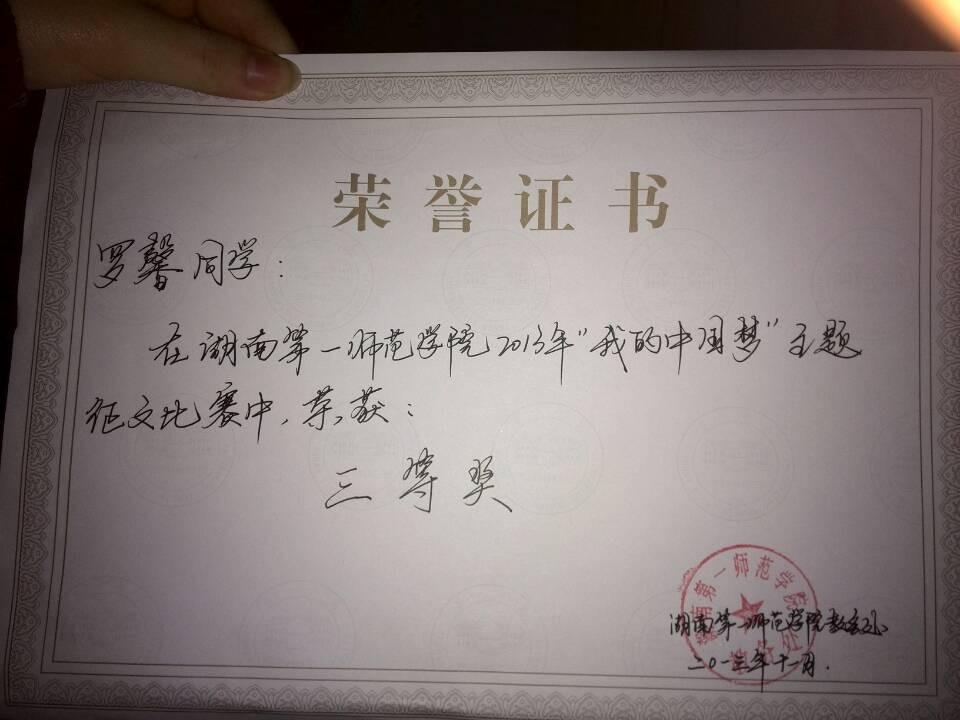 2013年BV伟德官方网站“我的中国梦”主题征文比赛中,罗馨荣获此次比赛三等奖。罗馨表示通过这次比赛不仅锻炼了自己的能力,同时让她更加清晰的了解了自己。她希望自己今后能够参加更多类似的比赛,并且取得更好的成绩。