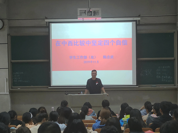 陈老师以“在中西比较中坚定‘四个自信’”为主题,从文化与道路、优势与自信两个方面详尽介绍了“四个自信”的背景、内涵和外延。课上,他结合许多生动的事例,通过中西文化比较、当今国际与国内形势分析,对“四个自信”尤其是文化自信进行了深入解析,为我们讲述了一堂生动的党课。
