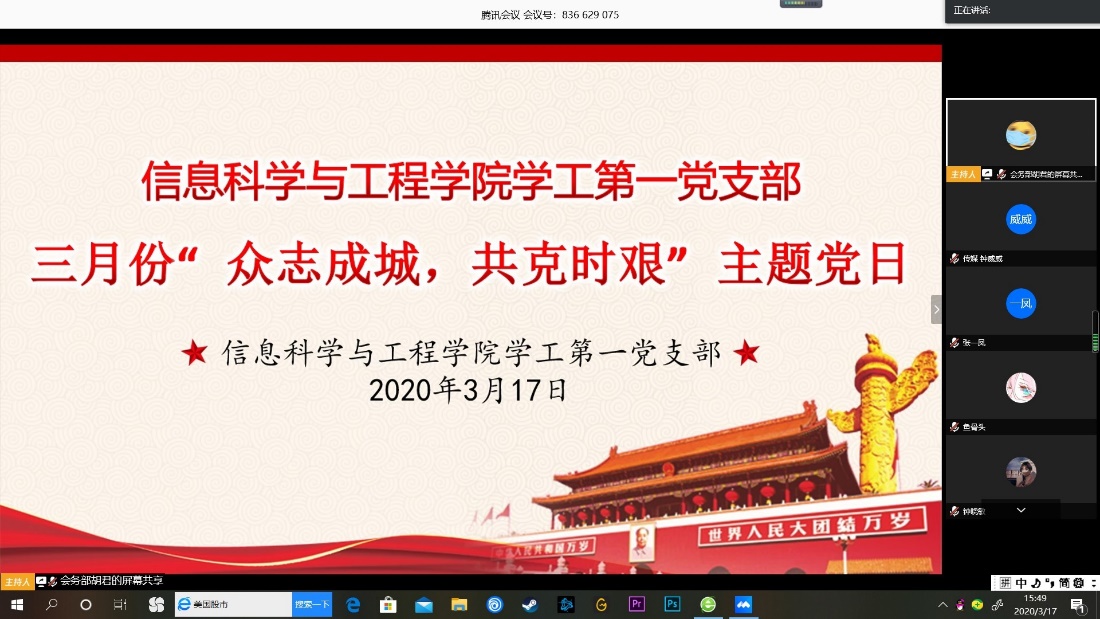 (通讯员 谢晓 邓世娇 钟威威) 3月17日下午,伟德官网学工第一党支部、第二党支部分别开展了“众志成城,共克时艰”主题党日活动,本次活动是通过腾讯会议系统在线进行的。学工办主任、学工第一党支部书记关红儒,学工办辅导员李荣敬以及两个支部全体党员参加,学院党总支副书记成夏炎以普通党员的身份参加了学工第二党支部的活动。关红儒、鲁谢若煊分别主持各自所在支部的活动。