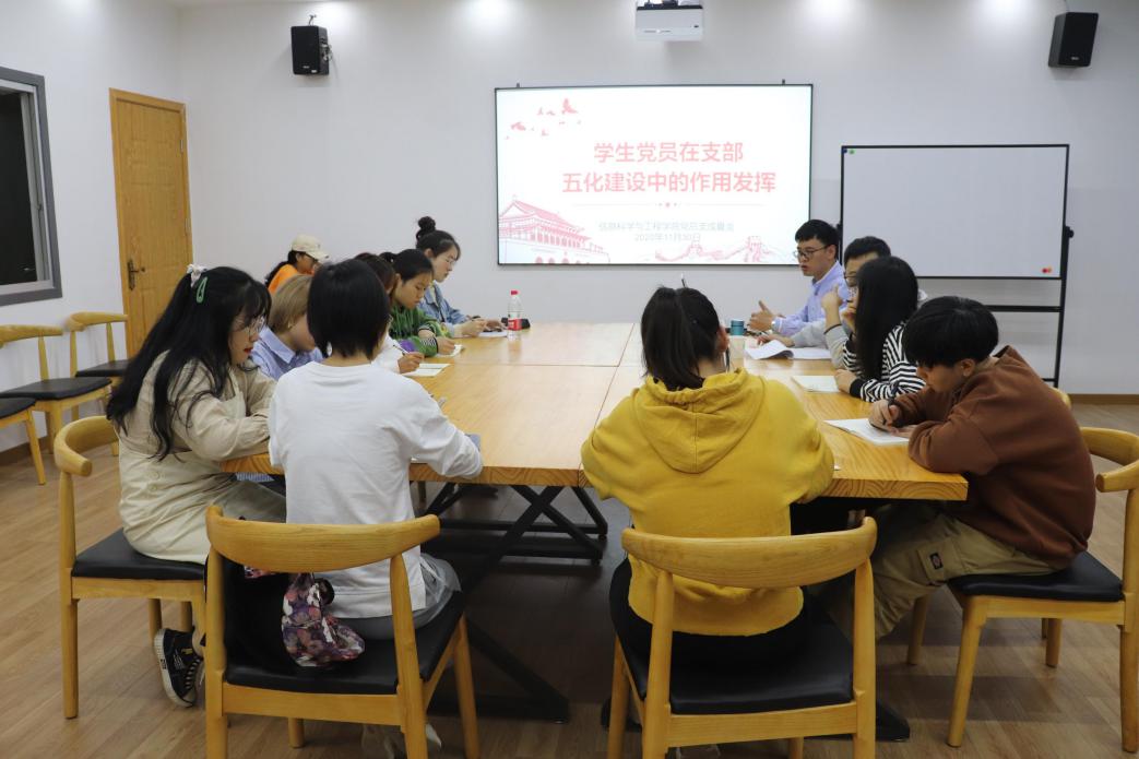 成夏炎就学生党员如何在五化建设中发挥作用这个问题进行阐述,他表示学生党员要做遵纪守法的标杆,做“勤学、修得、明辨、笃实”的表率,并引导学生党员思考怎样落实先锋模范作用,如何把“两学一做”制度化,把“不忘初心、牢记使命”常态化。