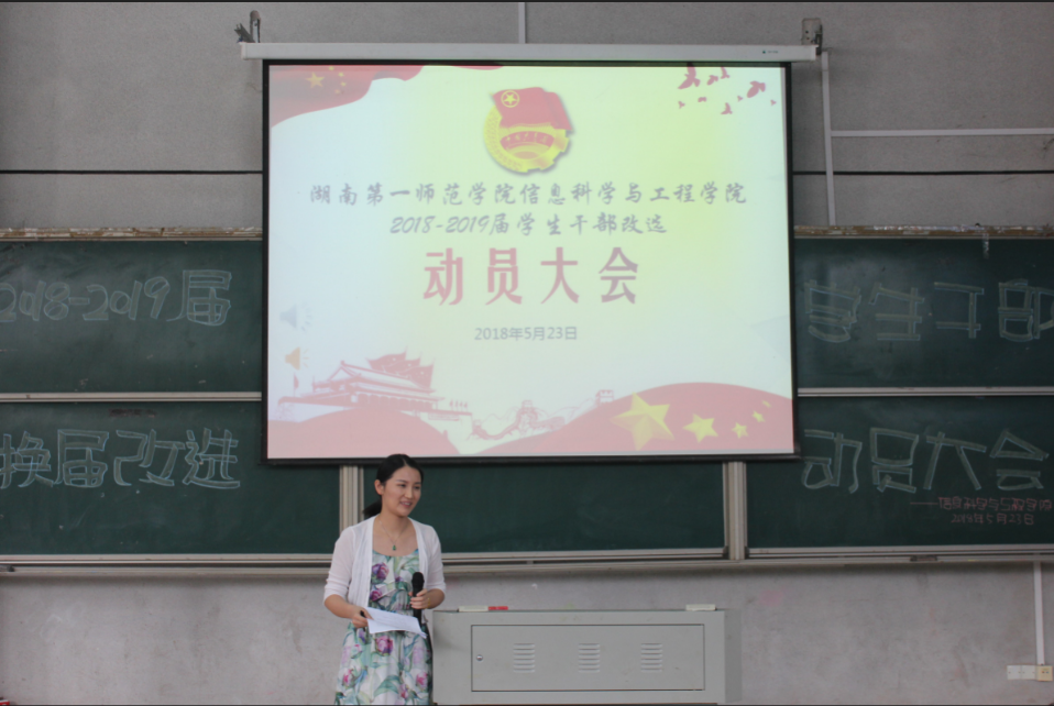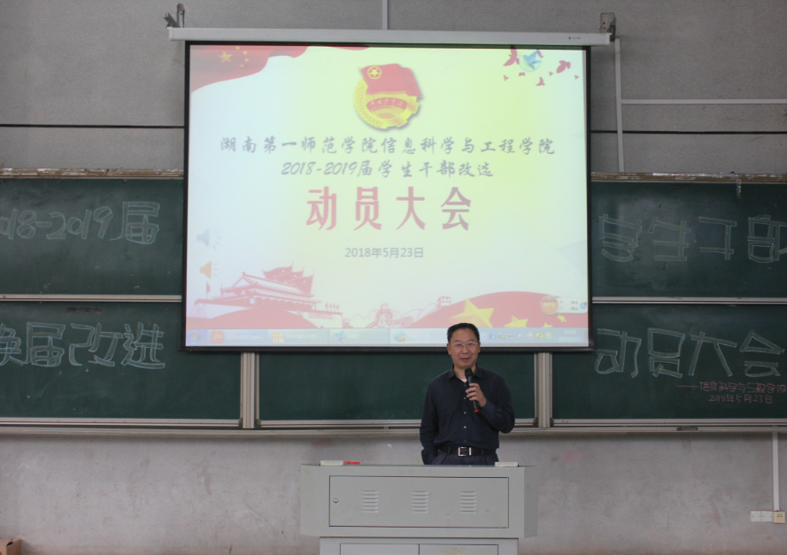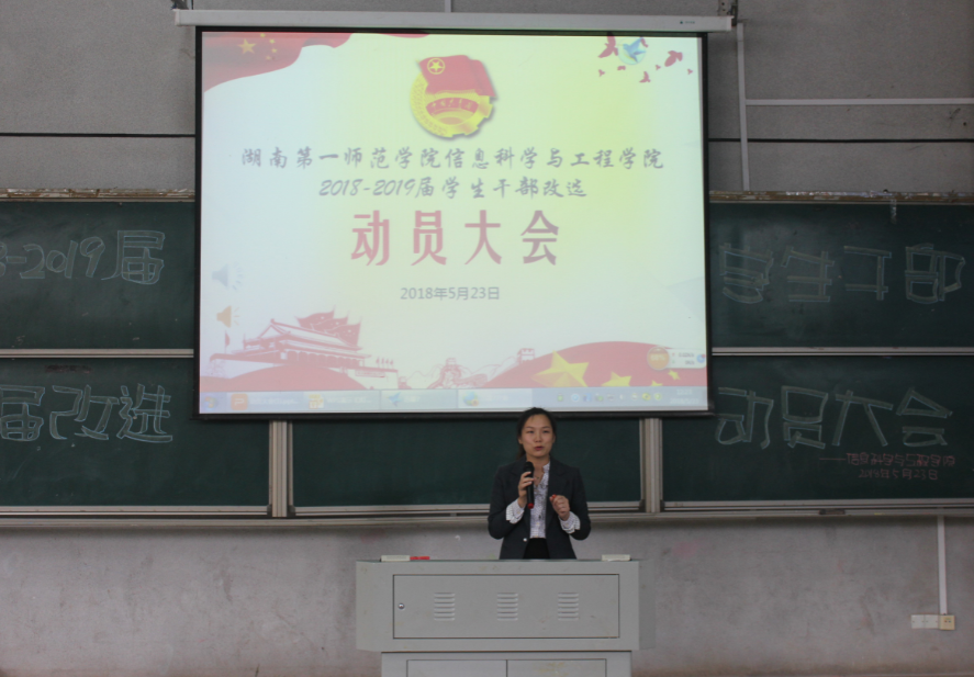 (通信员 向钰雪 邓力超 陈思迁)为推动伟德官网2016-2017届学生干部换届改选工作顺利完成,5月23日中午,信息科学与工程学院在文报厅举行了2018-2019届干部换届改选动员大会。学院党总支书记王杰文教授、党总支副书记易利老师学工办关红儒老师、唐瑞鸿老师、团学会全体学生干部和助理以及各班班长、团支书参加本次会议。会议由唐瑞鸿老师主持。
