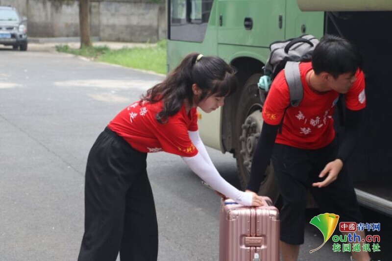 图为志愿者们到达学校,正在从车中卸下行李。中国青年网通讯员欧阳健摄