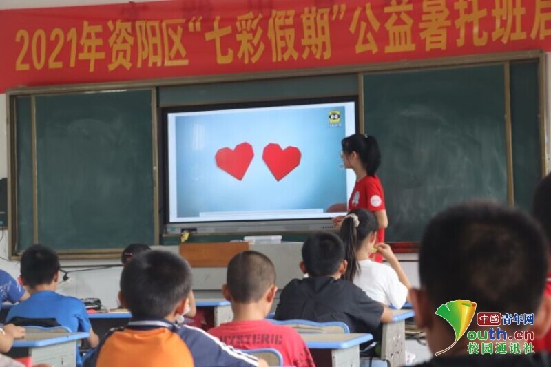 图为志愿者向孩子们演示如何将一张张彩纸折叠成爱心的形状。中国青年网通讯员 段新利 摄