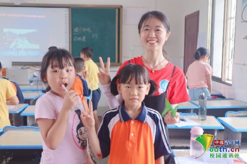 图为孩子们下课后将写好祝福语的折纸赠与任课老师。中国青年网通讯员 李惠婷 摄