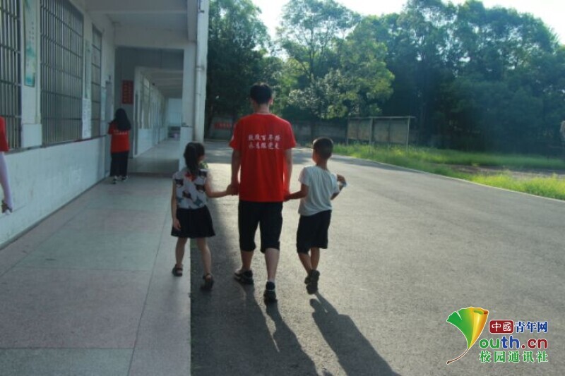 图为实践队员带领已报到的孩子进入教室,体现了一名合格教育者对学生的关爱。中国青年网通讯员 何星逸 摄