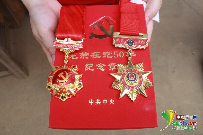 图为老党员“光荣在党50年”纪念章和抗美援越“参战50周年”纪念章。中国青年网通讯员 欧阳健 摄