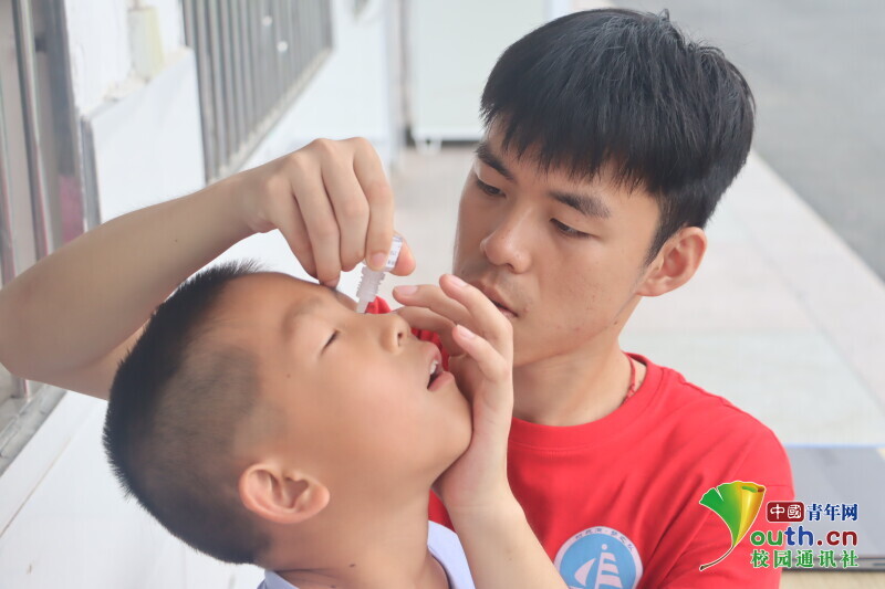 图为志愿者看到孩子自己滴眼药水不方便后给孩子滴眼药水的场景。中国青年网通讯员 段新利 摄