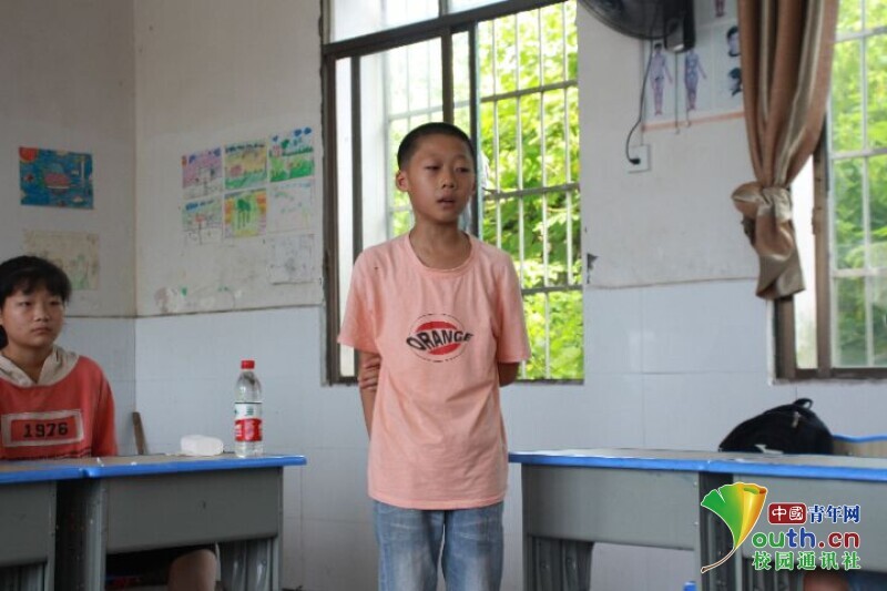 图为小男孩虽然很紧张,但是还是勇敢地站起来并完整流畅地讲完了这个故事。中国青年网通讯员 欧阳健 摄