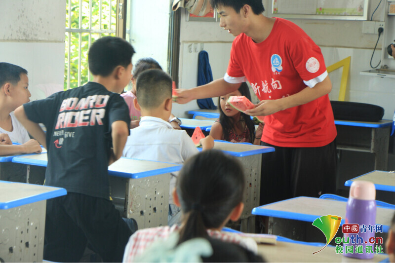 图为学生们乖乖地坐在椅子上等待老师给自己分西瓜。中国青年网通讯员 段新利 摄
