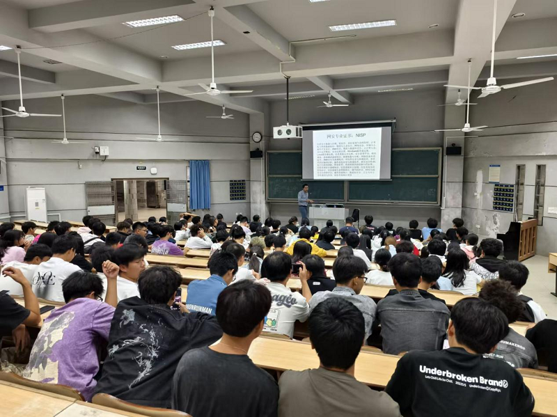 周聪详细介绍了网络空间安全专业的重要性和广阔前景。他指出,在当今数字化时代,网络空间安全已成为国家安全的重要组成部分,无论是企业还是政府机构,都对网络空间安全专业人才有着迫切需求。他通过生动的案例和数据,让新生们深刻认识到自己所学专业的价值和责任。随后,他就专业课程设置、教学方法和实践教学环节进行了深入讲解。他强调,网络安全专业不仅注重理论知识的学习,更强调实践操作能力的培养。学校正在筹建网络安全实验室、密码学实验室,为同学们提供了丰富的实践机会,让大家在实践中不断提升自己的专业技能。