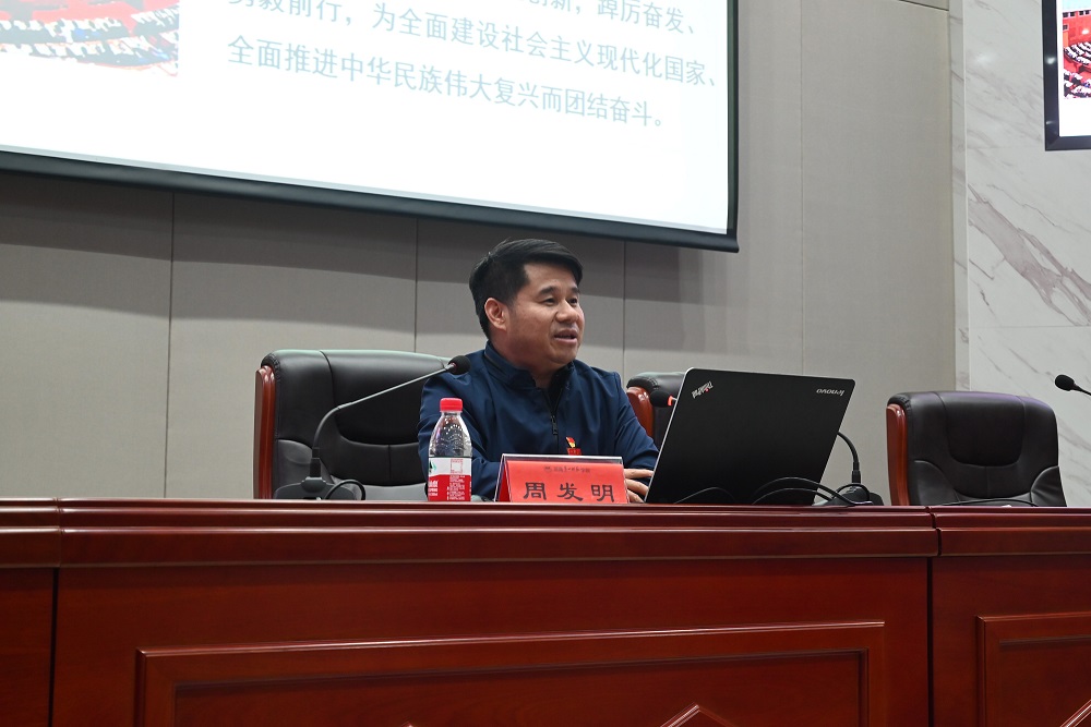 周发明从党的二十大召开的历史背景、大会主要内容、大会的主要成果等三个方面进行了讲授,重点介绍了二十大报告重要内容。周发明指出,党的二十大报告是在全党全国各族人民迈上全面建设社会主义现代化国家新征程、向第二个百年奋斗目标进军的关键时刻召开的一次十分重要的大会。大会报告,回顾总结了过去五年的工作和新时代十年的伟大变革,阐述了开辟马克思主义中国化时代化新境界、中国式现代化的中国特色和本质要求等重大问题,擘画了全面建成社会主义现代化强国的宏伟蓝图和实践路径,就未来五年党和国家事业发展制定了大政方针、作出了全面部署。
