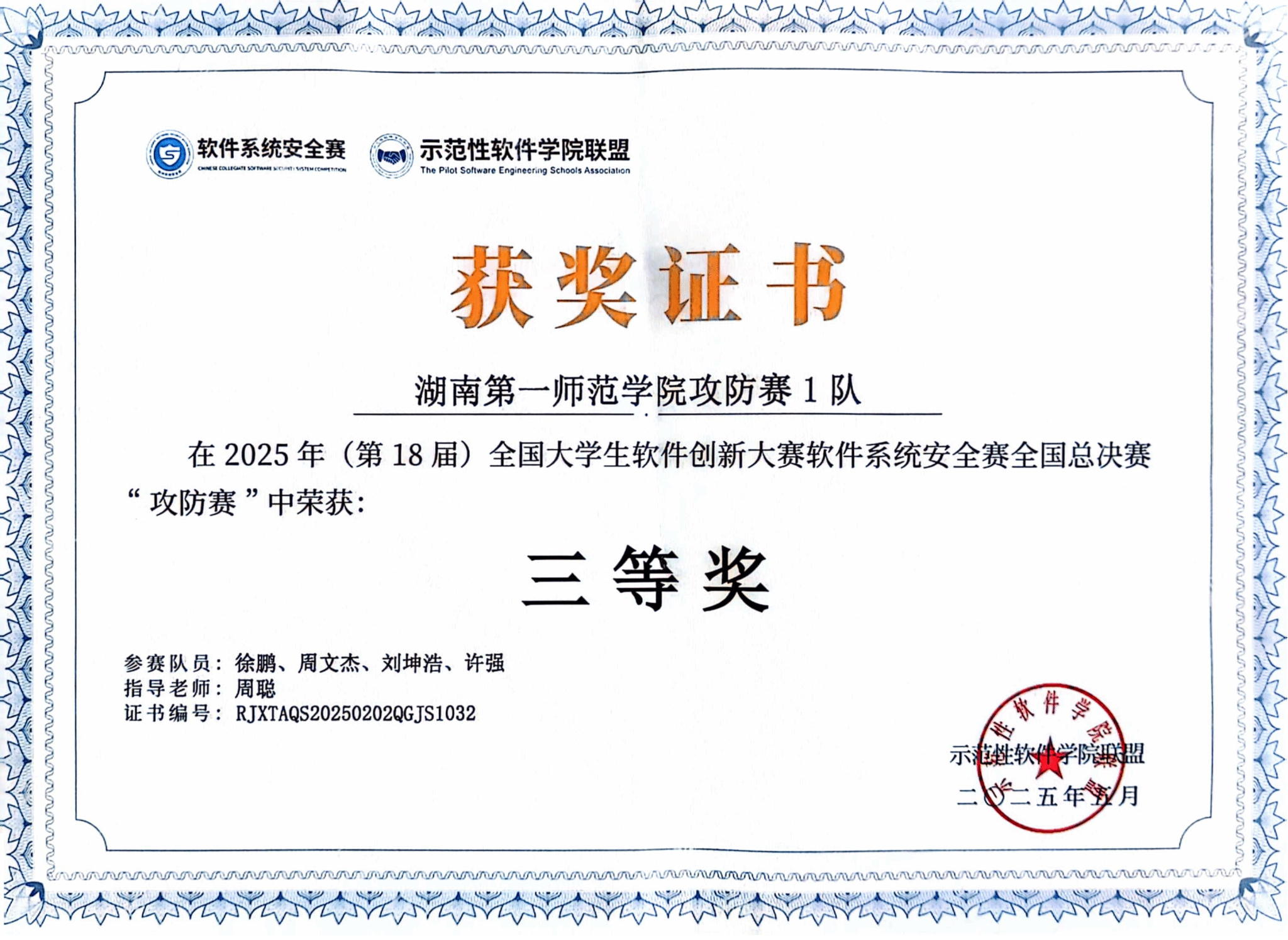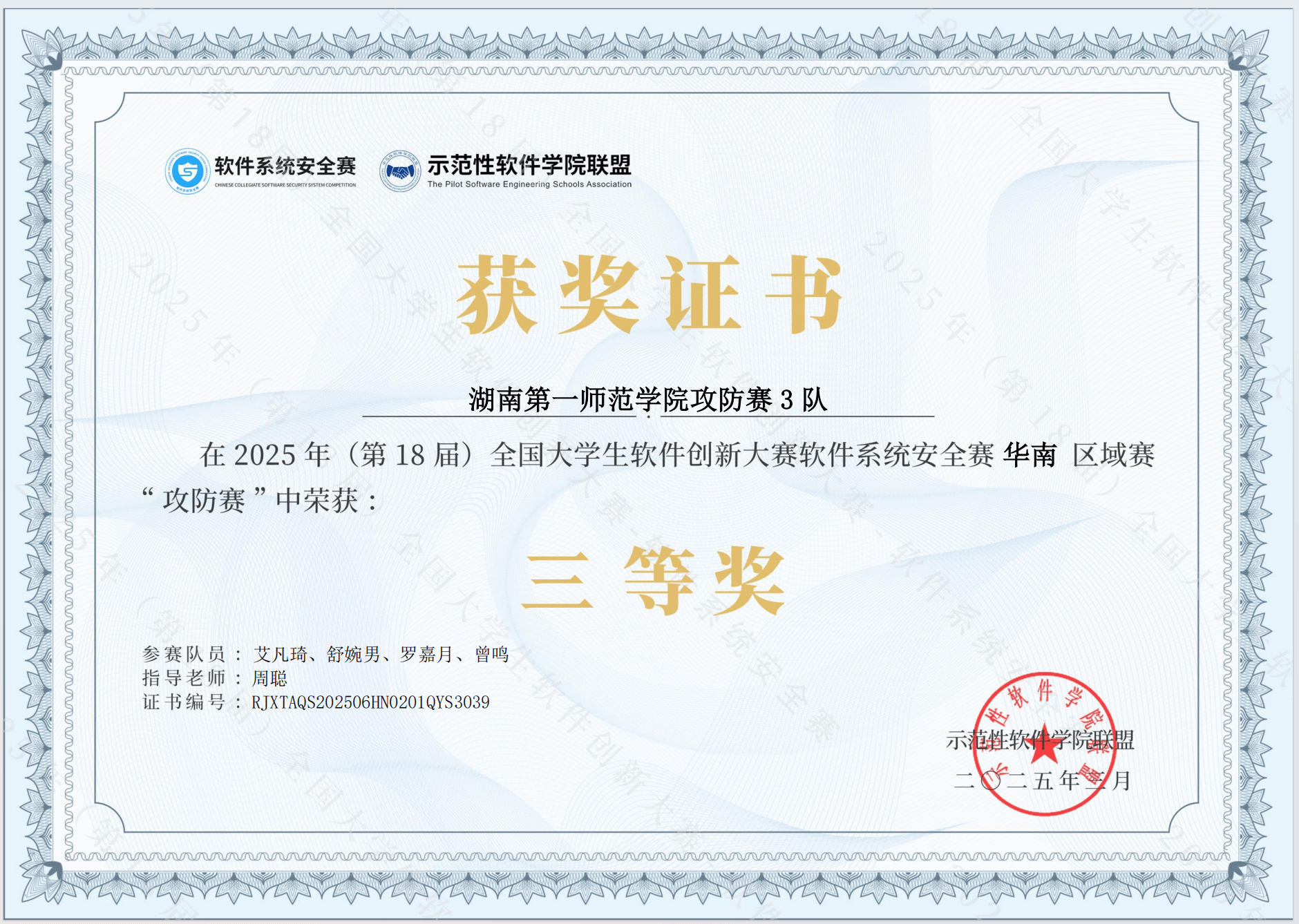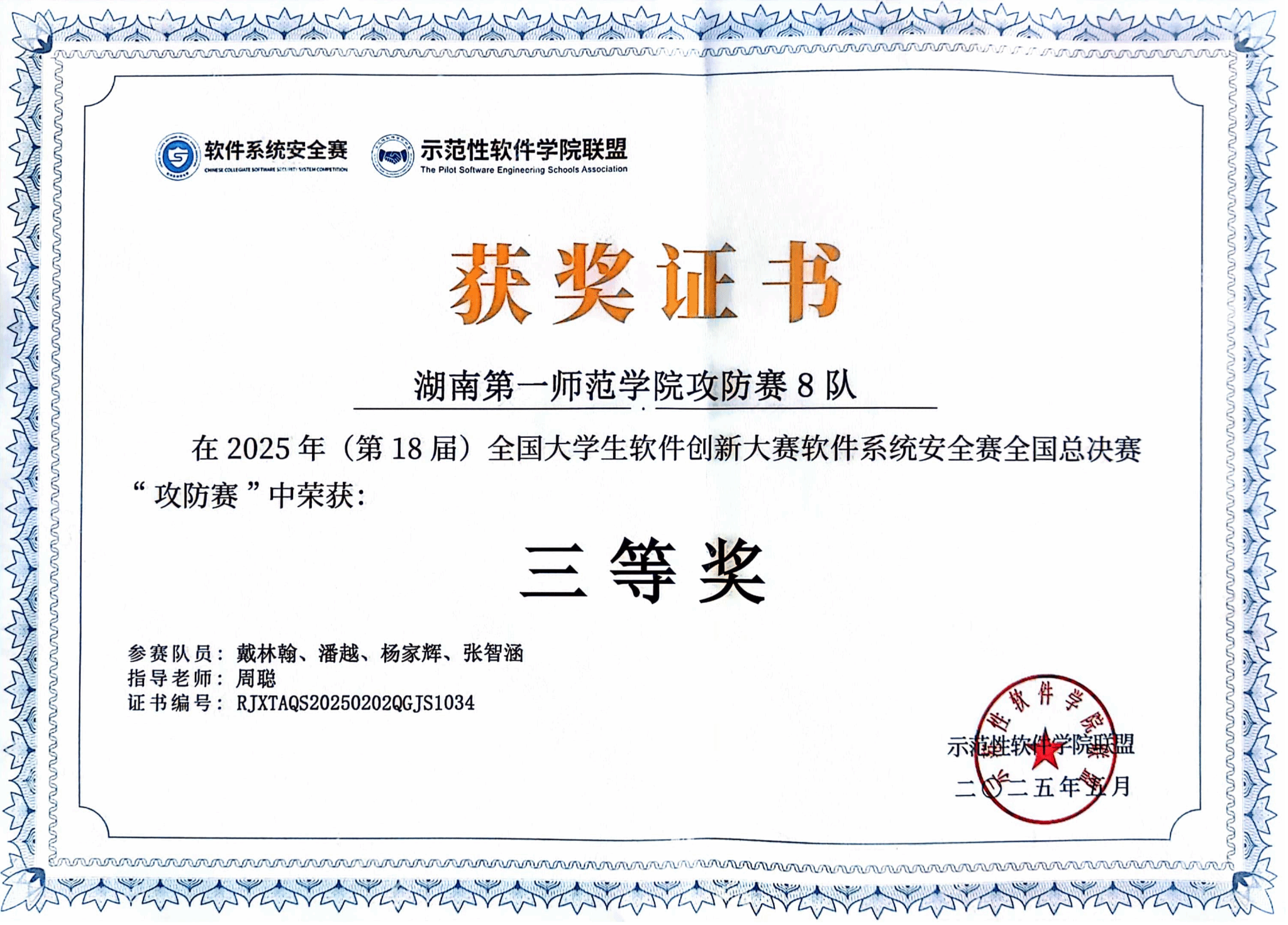 第18届全国大学生软件创新大赛软件系统安全赛全国总决赛于2025年5月18日在湖南大学圆满落幕。湖南高校共有18支团队获奖。其中我院的2支参赛团队荣获攻防赛三等奖,实现了网安竞赛团队在国家级赛事中获奖的突破。在区域赛阶段,伟德官网参赛团队表现出色,斩获一等奖2项、二等奖1项、三等奖3项,位居华南赛区前列。