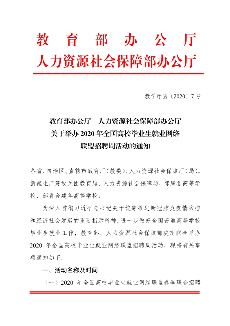 教育部办公厅 人力资源社会保障部办公厅关于举办2020年全国高校毕业生就业网络联盟招聘周活动的通知