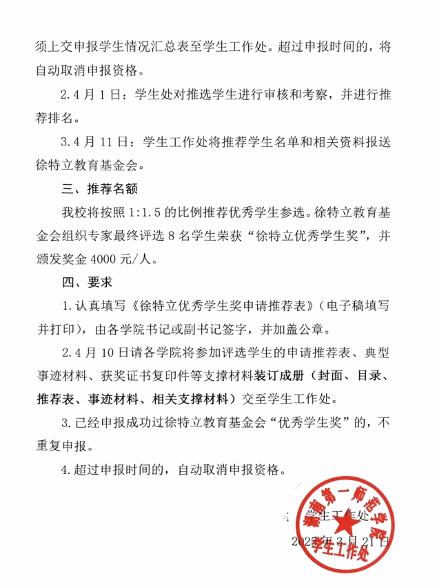 关于评定2023-2024学年度北理徐特立奖学金的通知