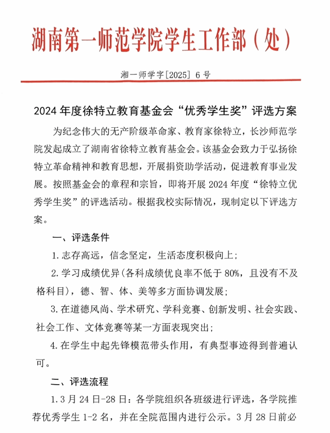 2024年度徐特立教育基金会“优秀学生奖”评选方案