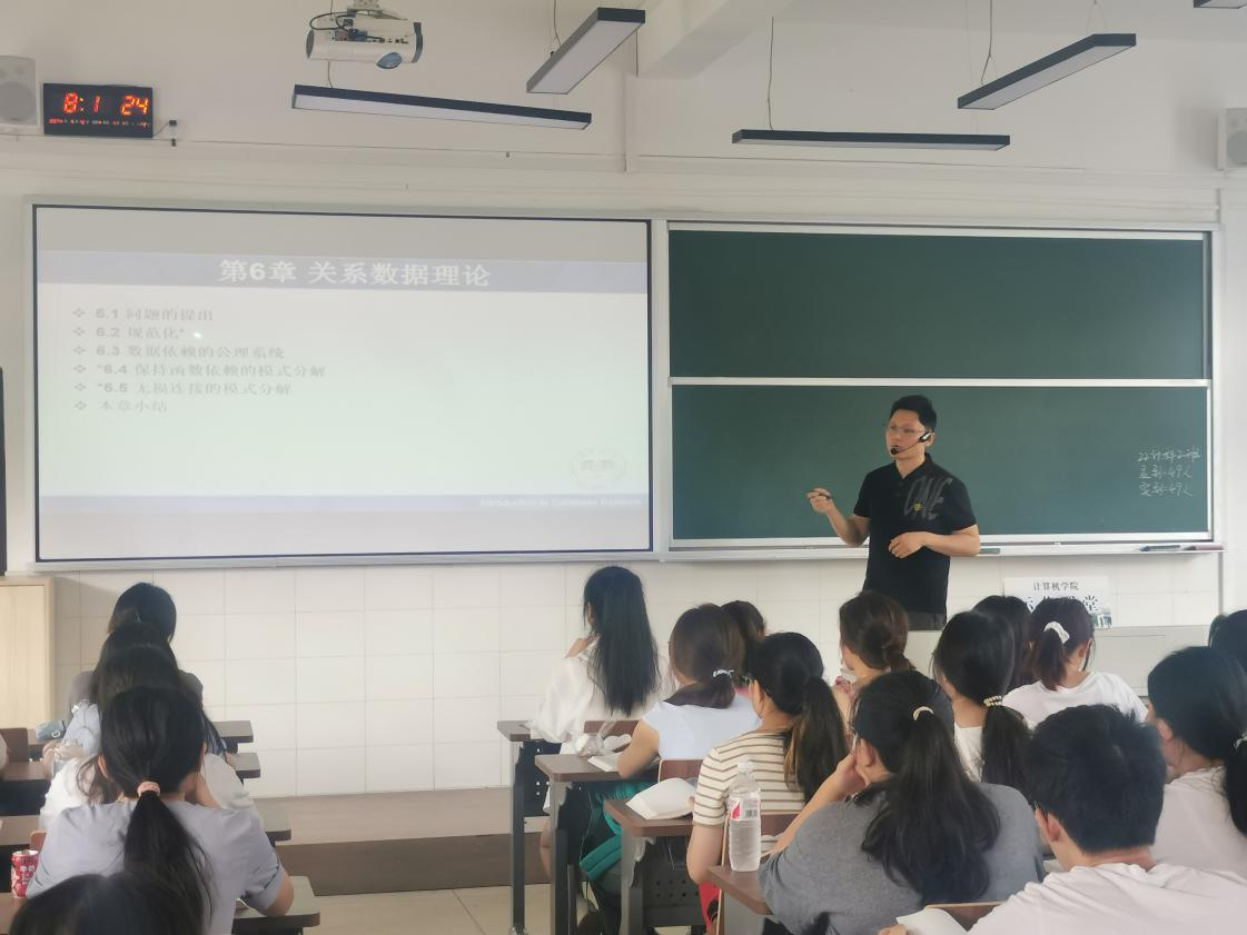5月16日上午,林开彬在玉衡楼506为22计科2班的同学主讲了《数据库原理及应用》课,内容是关系数据理论中的函数依赖。林开彬利用思维导图的形式回顾了数据库完整性的相关内容,为本节内容的讲授做了较好的铺垫。他通过高校应用开发中的实例引出关系数据理论的必要性,极大地激发了学生的学习兴趣。整堂课上,林开彬教学的亲和力使课堂氛围轻松愉快,学生们的听课效果较好。